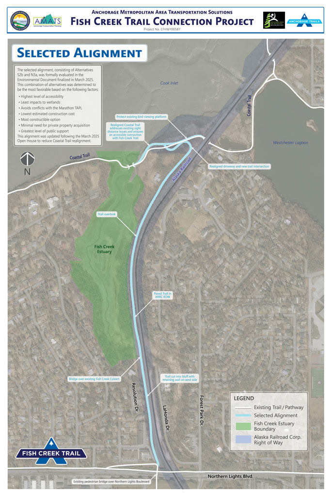 | January 2026 Project Update: The project completed the environmental document in March 2025 which finalized selection of the preferred alternative. The March 19th Open House #2 provided a status update and an opportunity for input on specific project elements as the project team advances towards the 75% Design (Plans in Hand), the first draft of detailed design. The Plans in Hand submittal was completed November 2025, incorporating comments about the Coastal Trail realignment following Open House #2. The project team continues coordination with the Alaska Railroad, Marathon Pipeline, and other stakeholders as it advances the selected alignment to final design. Links to the completed Environmental Document and current design are available here. |
